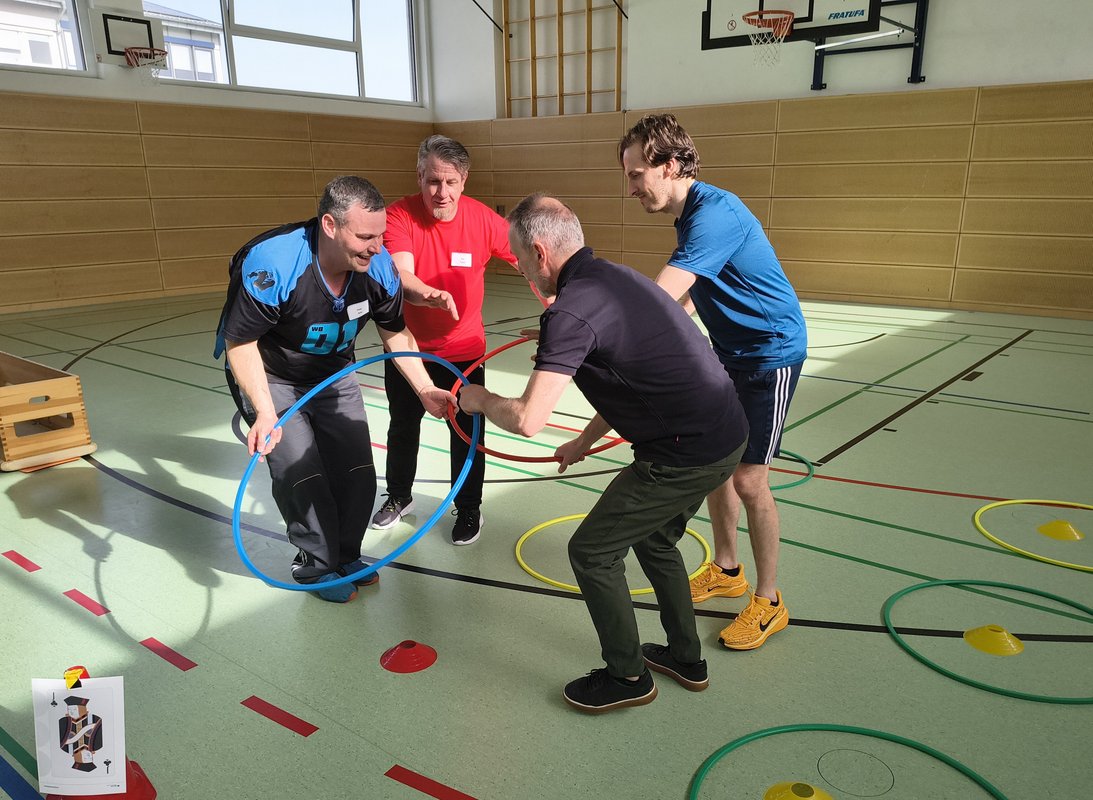 In einer Sporthalle stehen vier Männer in Sportkleidung im Kreis und hantieren mit bunten Reifen.