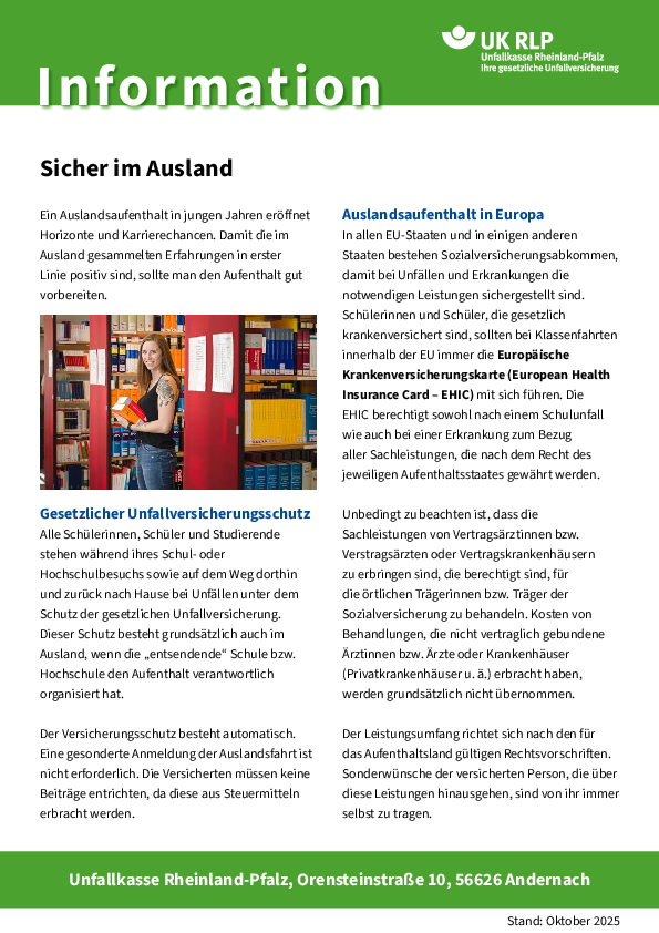 Hier finden Sie eine Übersicht unserer aktuellen Informationsblätter für Schulen und Hochschulen zum Versicherungsschutz und zu unseren Leistungen.