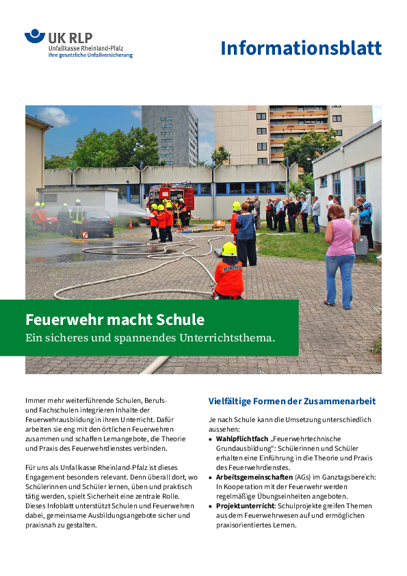 Brandschutz ist ein zentrales Thema für Schulen. Daher hat die Unfallkasse Rheinland-Pfalz in Kooperation mit dem Ministerium für Bildung, dem Landesfeuerwehrverband Rheinland-Pfalz, dem Institut für Lehrergesundheit und der Aufsichts- und Dienstleitungsdirektion unter Beteiligung der kommunalen Spitzenverbände drei Bausteine entwickelt, die die Brandschutzorganisation an Schulen verbessern sollen. Folgende Bausteine sind vorgesehen:
