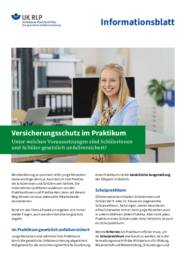 Praktika bieten die Chance, dass sich Betriebe und Jugendliche beziehungsweise Schülerinnen und Schüler zur Vorbereitung eines Lehr- oder Anstellungsverhältnisses kennenlernen. Während dieser Praktika besteht grundsätzlich gesetzlicher Unfallversicherungsschutz, wie für die anderen Beschäftigten auch.